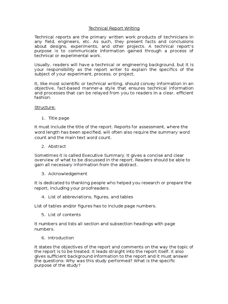 A technical report must inform readers of the reasons, means, results, and conclusions of the subject matter being reported. The mechanics and format of writing a report may vary but the content is always similar. EXPERIMENTAL DETAILS Many engineering writing is centered on reporting of experimental works. In such a case A technical report example is a written document made by a researcher which contains the details about a project’s results. After creating the technical report, the researcher submits it to the project’s sponsor How to write a good technical report 2 Before writing the first word: Make your mind regarding the message you want to convey Try to define the likely audience: Technical audience Non-technical, e.g., general public Taking into account the audience’s limitations and the message you want to convey, choose an appropriate outlineFile Size: KB